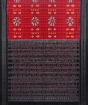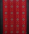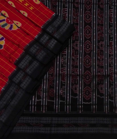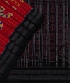A Sambalpuri saree is a traditional handwoven ikat saree wherein the warp and the weft are tie-dyed before weaving. Sambalpuri saris are known for their incorporation of traditional motifs like shankha (shell), chakra (wheel), phula (flower) but the high point of these saree is the traditional craftsmanship of the Bandhakala the Tie-dye art reflected in their intricate weaves, also known as Sambalpuri Ikkat. Red and black sambalpuri baghambari silk saree comes with beautiful lineing motifs on the body,rudraksha dobby motifs on border and beautiful flower motifs with elephant & lion motifs on pallu.