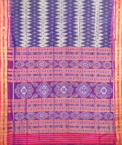 Weaver communities of Nuapatana of Cuttack, Odisha traditionally weave this kind of pata.The motif has an auspicious elephant that represents Buddha surrounded by trailing vine with peacocks in it, a large many petaled flower, a unique Orissan animal called Nabagunjara, a deula kumbha. The elephant in Khandua ikat from Nuapatana usually varies from elephant motives in ikat from Sambalpuri saree as well as ikat from other parts of Odisha.Blue and red khandua silk saree comes with flower motifs on the body,flower motifs onborder and beautiful flower motifs on pallu.